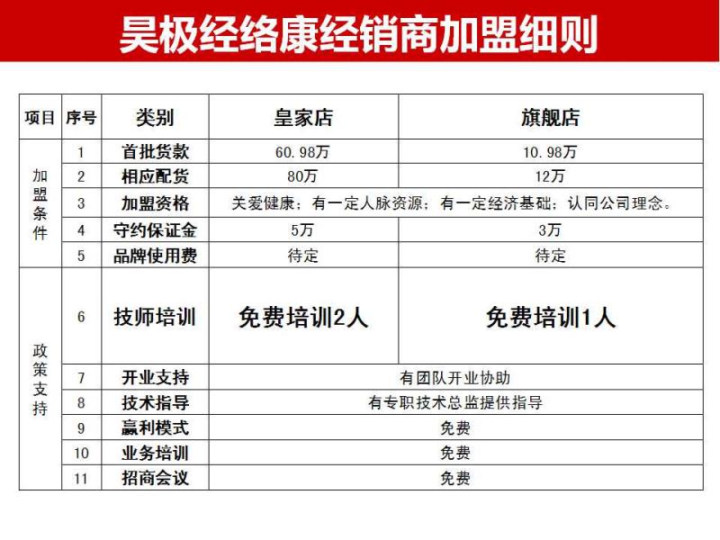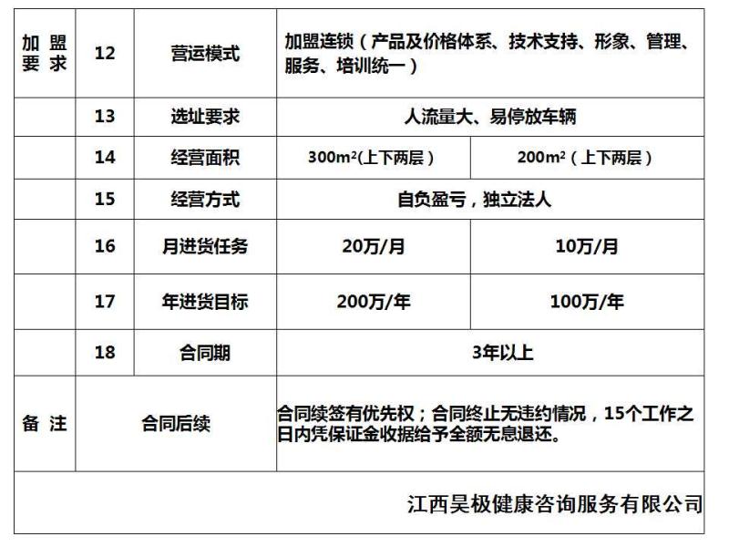 備注:合作費用:是加盟級別套餐的費用,需要交給公司。(不同的加盟級別,公司會提供包括店內產(chǎn)品,配合項目儀器,店內VI形象宣傳物品,員工工裝等)